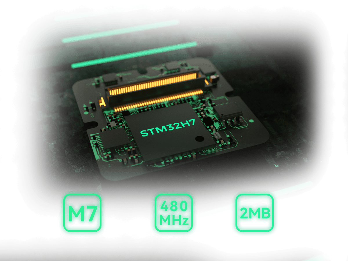 Nora+ autopilot uses STM32H743 series processors CPU, Cortex-M7 core (with double precision Floating-Point Unit). It makes operating frequency increase to 480Mhz, 2MB Flash,1MB RAM Meet the higher computing needs of flight controllers Compared with the STM32F7 product line, the dynamic power consumption efficiency is doubled.